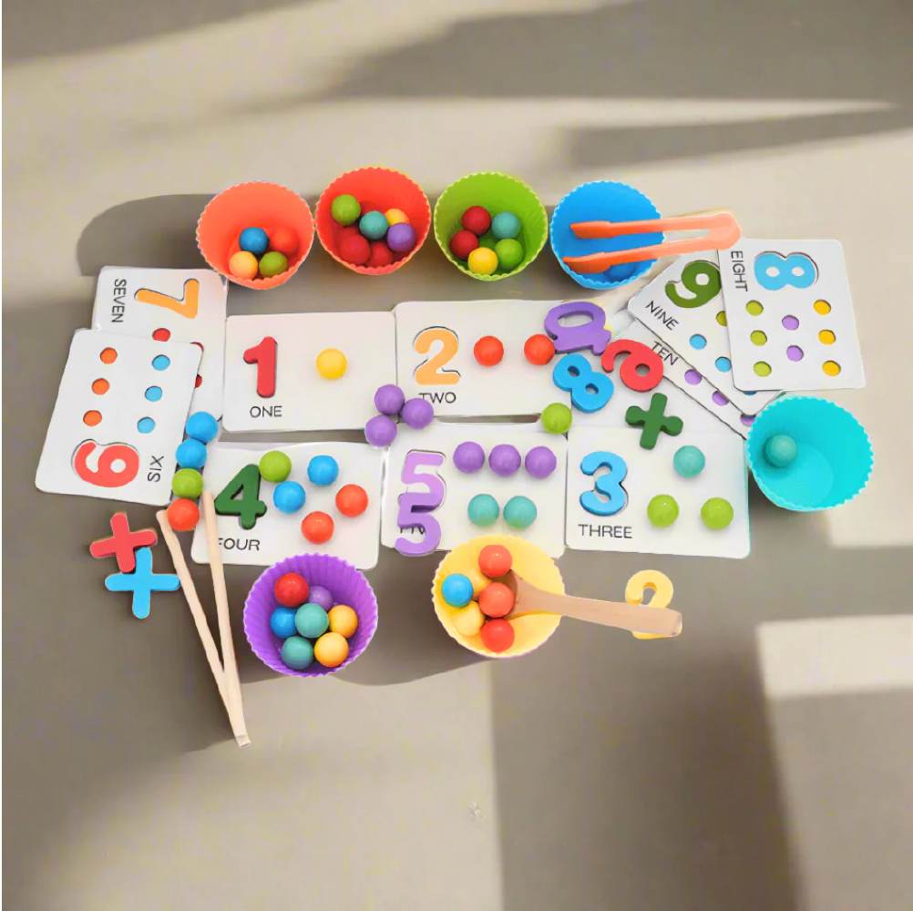 The Clip Beads Matching Game is an educational and fun-filled toy designed to help young children develop essential math and motor skills. Its colorful beads, cups, and number cards are perfect for interactive learning through play.