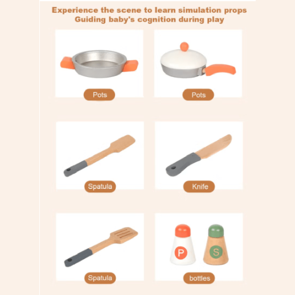 - 2、【Ready to Play Immediately】: Come with many accessories, including cutting tool, toy kitchen sets, a Pots, Pots、Spatula、Knife、Spatula、bottles. Exclusive design wooden play kitchen set, Ideal gift for kids birthday.