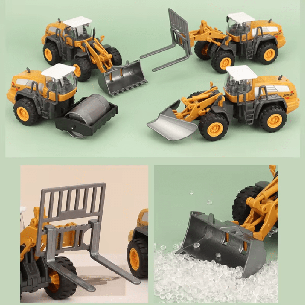 4 different construction vehicles with high quality platsic body, rubber wheels and die cast metallic end parts.
