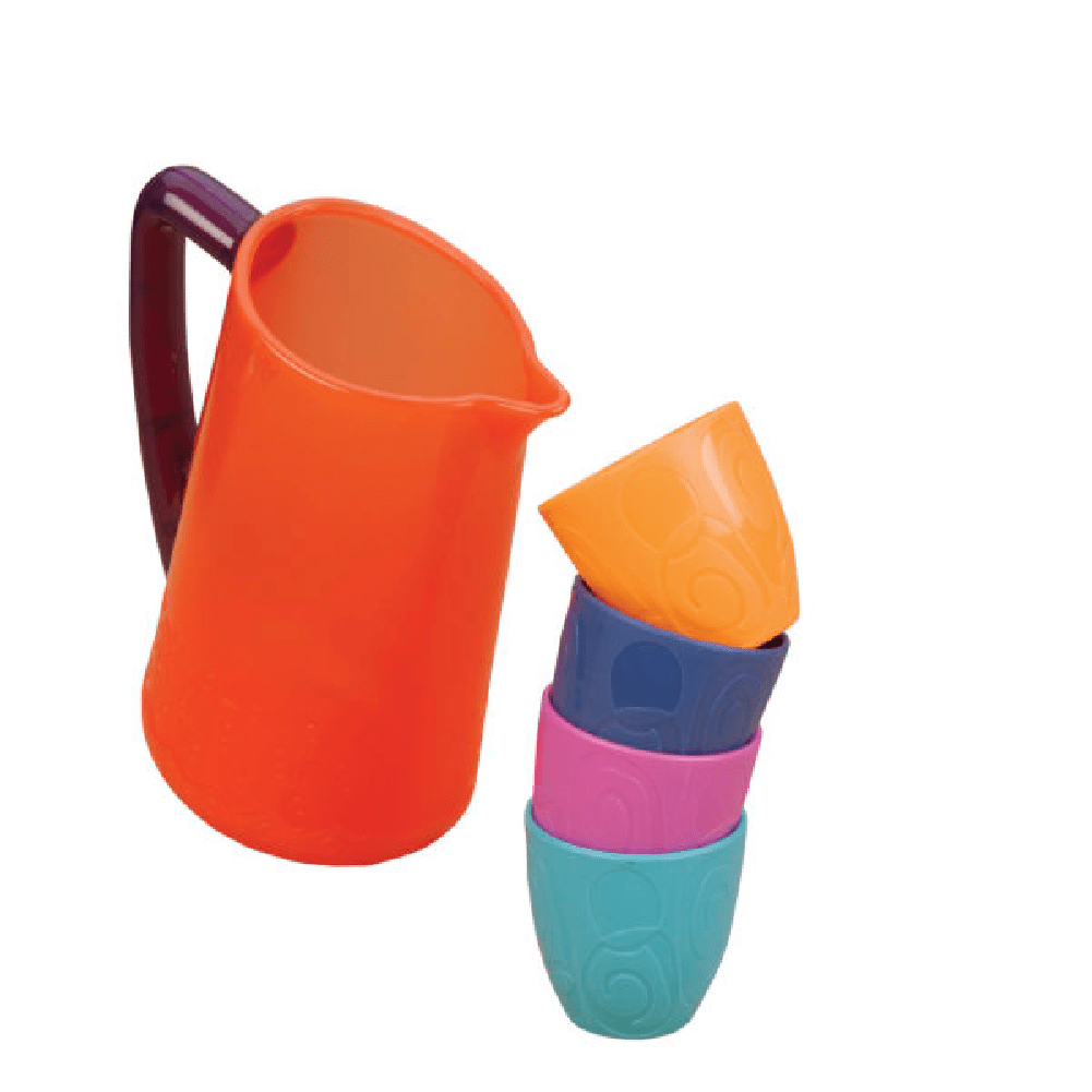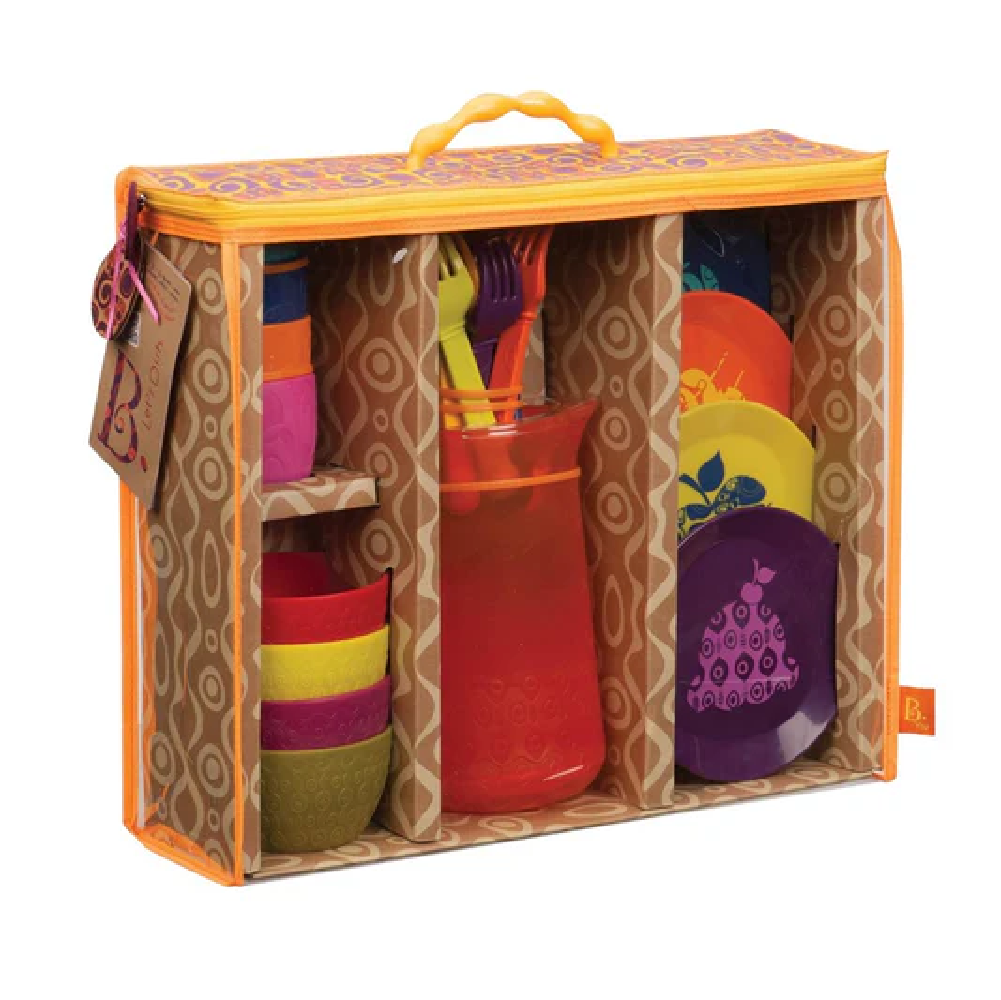 Plan a dinner party for four with the Let’s Dish play set from B. toys! This 25-piece dish set for kids comes with everything little cooks need to serve make-believe breakfast, lunch, or dinner. Pour pretend juice from the big pitcher into the colorful cups, use the beautifully-designed bowls for soup or cereal, dream up delicious recipes and put them on the plates, then eat it all up with the kid-friendly cutlery! These play kitchen accessories promote creativity, spark the imagination, and can help toddlers develop their fine motor skills. Not to mention, playing with these toy dishes can also teach kids about important like skills! Recommended for children 3 years and over.