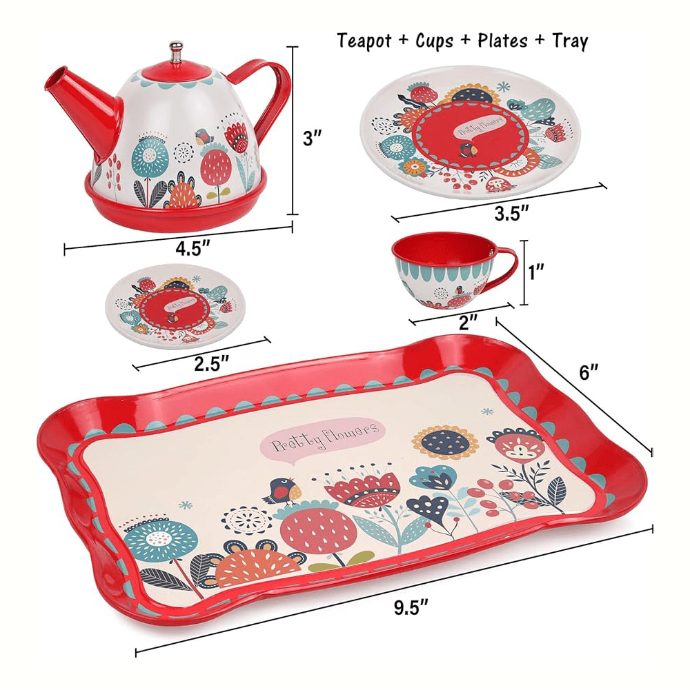 PRODUCT DIMENSIONS – Teapot – 4.5″ L (including handle and spout) x 3″ H. Cups – 2″ L x 1″ H. saucers – 2.3″ D. Plates – 3.5″ D. Tray – 9.5 L x 6″ W.