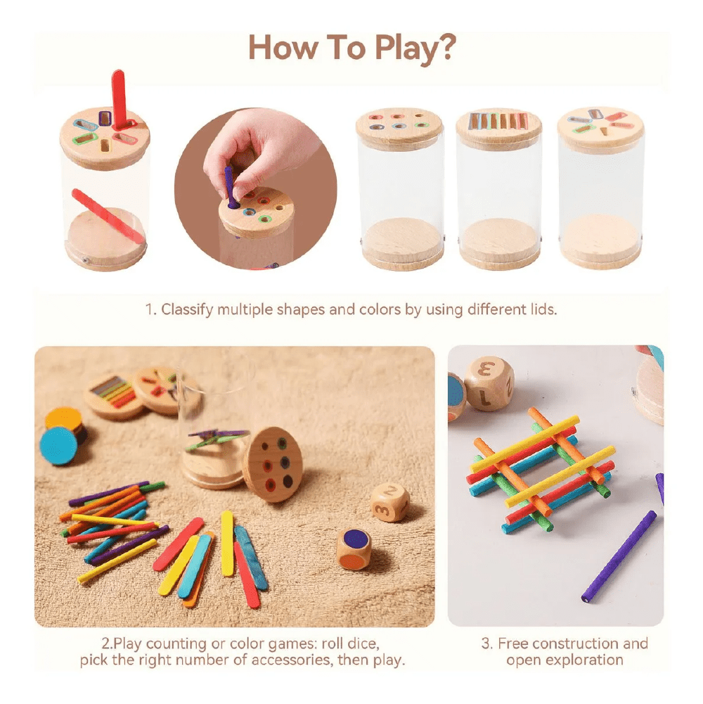 Sensory Toys: Shape and color sorting toys can enhance children’s multidimensional cognition of quantity, color, and shape by inserting slices or sticks into the corresponding slots.